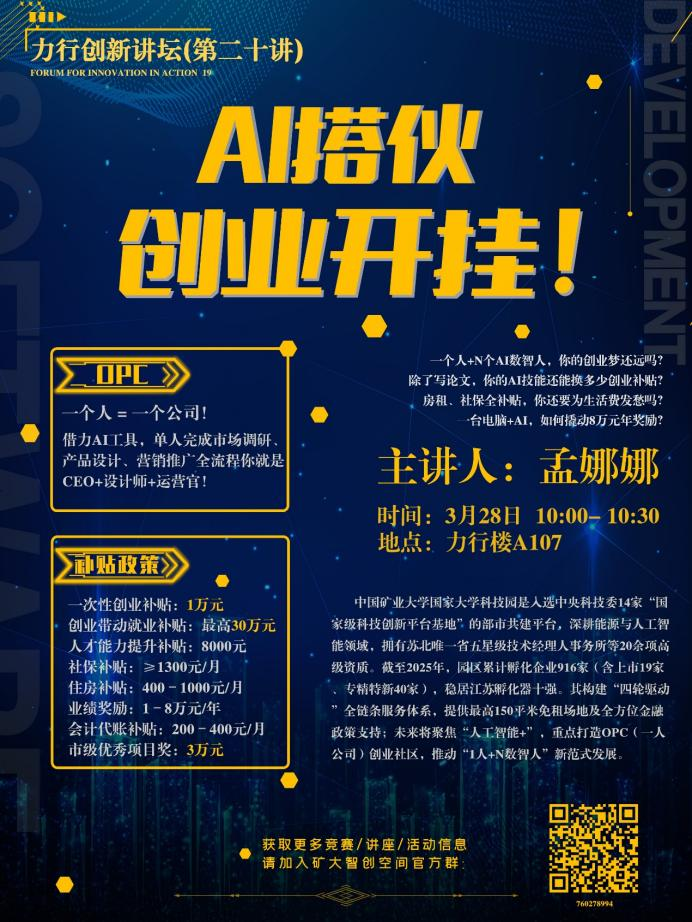3月28日,为抢抓“人工智能+”时代机遇,力行创新讲坛特邀中国矿业大学国家大学科技园举办“解锁AI时代·智能创新创业”专题宣讲会。矿大科技园创业服务部部长孟娜娜担任主讲,旨在帮助在校师生全面掌握“一人公司(OPC)”创业新范式,精准对接政策红利,破解创业落地难题。
